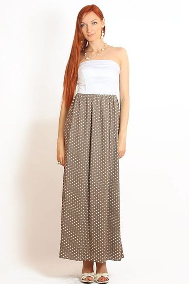 ОписаниеКрасивый сарафан в пол! Данная модель интересна тем, что верхняя часть представляет собой белый эластичный топ-бандо на резинке сзади, а нижняя часть - свободная юбка клеш из ткани цвета "кофе с молоком" в белый горошек.