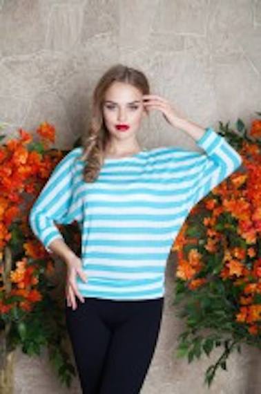 ОписаниеЛетняя блузка в полоску голубого цвета. Крой укороченный с широкими рукавами "летучая мышь" и круглой горловиной.
