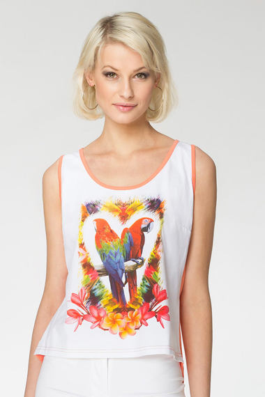 Красивый летний топ с округлой горловиной. Впереди топ украшает принт с попугаями, спинка однотонная - персикового цвета.