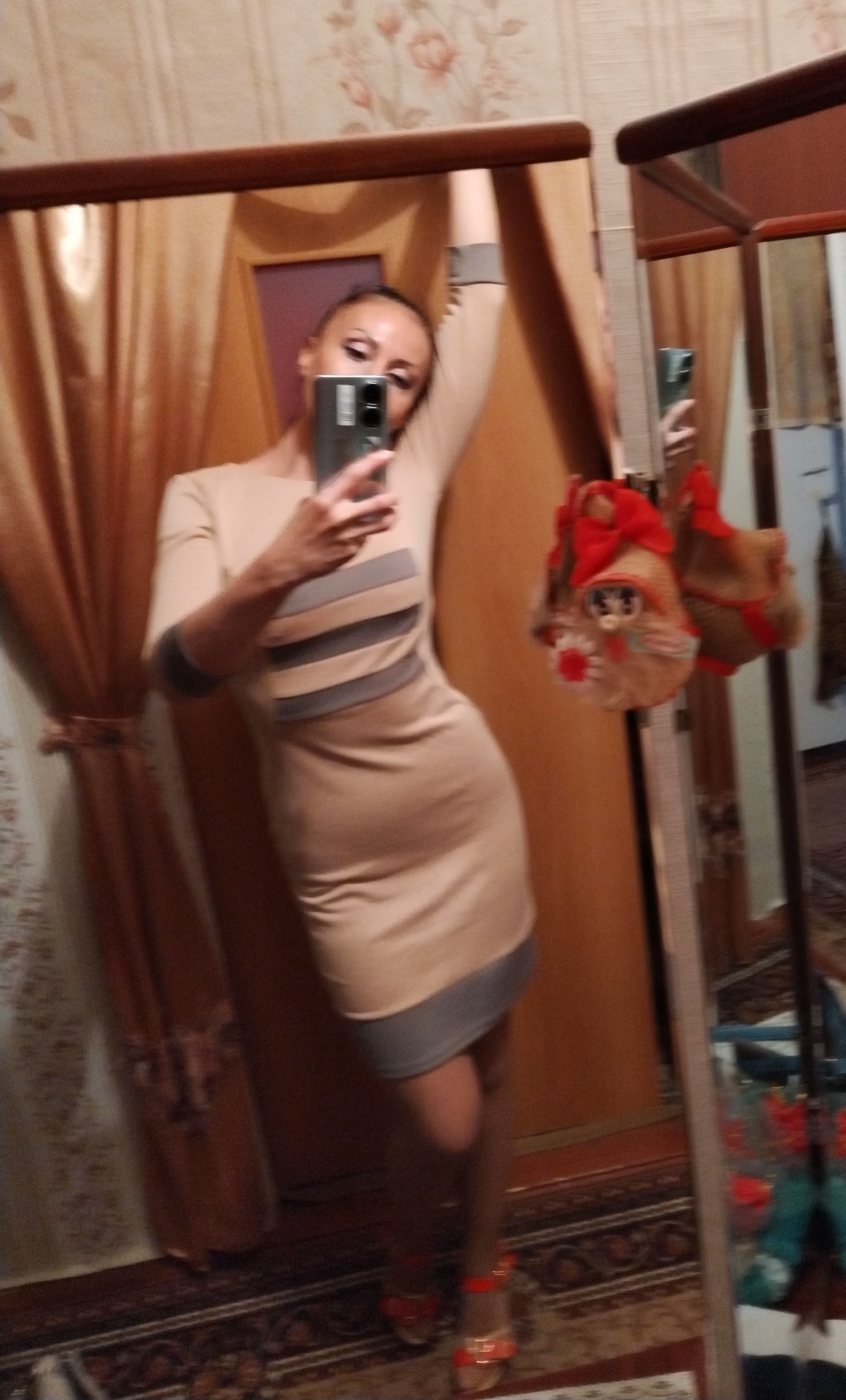 Элегантное платье длиной до колен, приталенного кроя, с длинными рукавами. Платье сшито из бежевой ткани с красивыми коричневыми вставками.