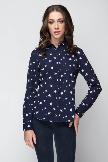 ОписаниеМодная темно-синяя блузка с принтом "звезды". Модель классического приталенного кроя, на груди накладной карман.
