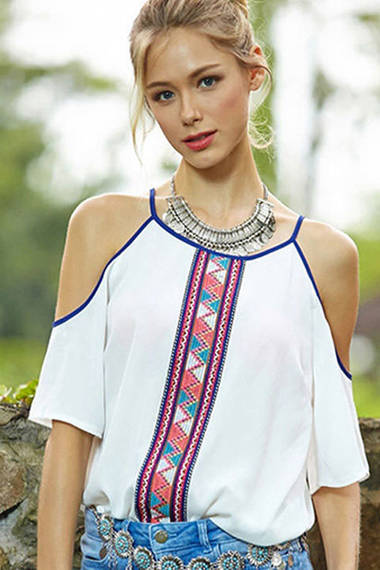 Фото товара 9101, блуза из полиэстера с открытыми плечами